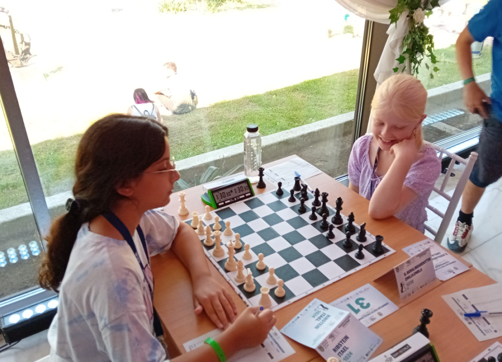 Emilía Embla B. Berglindardóttir (1238) mætti ísraelskri stúlku Itael Ribstein (1045). Eins og í gær var Emilía að tefla vel framan af skákinni og komin peði yfir. Við tókum þann lærdóm úr fyrstu tveimur skákunum að huga betur að kóngsstöðunni og þá er hægt að njóta betur ávaxta liðsvinningana!