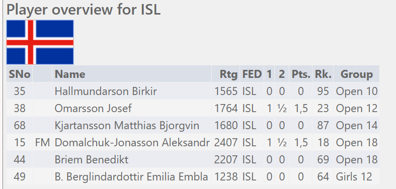 Íslensku keppendurnir að þessu sinni eru: Aleksandr Domalchuk-Jonasson og Benedikt Briem í U18, Matthías Björgvin Kjartansson í U14, Josef Omarsson í U12, Birkir Hallmundarson í U10 og Emelía Embla B. Berglindardóttir í U10 stelpna. Þjálfari er FIDE-meistarinn Ingvar Þór Jóhannesson.