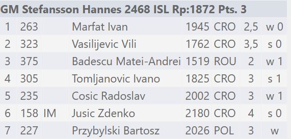 Hannes er stigahæstur Íslendingana á atskákstigum en byrjaði mótið illa og tapaði fyrir tveimur stigalágum Króötum. Þrjár vinningsskákir fylgdu í kjölfarið en svo kom tap í sjöttu umferð og Hannes hefur 3 vinninga af 6.