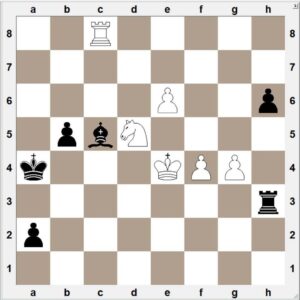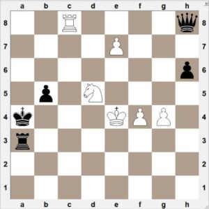Minnir á skákþraut eftir Kubbel. Svartur getur ekki tekið hrókinn vegna 55. Rb6+ sem vinnur.