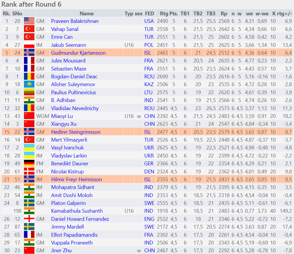 Héðinn tapaði erfiðri skák gegn stigahæsa manni mótsins Bogdan-Daniel Deac þar sem hann lenti í langri og strangri vörn. Hilmir Freyr átti góðan dag, tefldi við tvo tyrkneska stórmeistara og fékk 1,5 vinning…gerði stutt jafntefli við Yilmazerli í 6. umferðinni. Jóhann Hjartarson hefur einnig 4,5 vinning en var í dauðafæri að komast í hóp efstu manna, missti vænlegt tafl í jafntefli. Loks er Hannes Hlífar einnig með 4,5 vinning en stendur illa á oddastigum með tvær hjásetur.