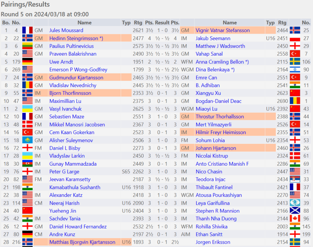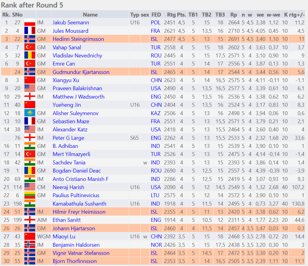 Mikið var um jafntefli á efstu borðum og það var aðeins Frakkinn Jules Moussard sem bættist í hópinn með Héðni og Seemann. Því miður lagði Frakkinn okkar mann, Vignir Vatnar Stefánsson að velli. Vignir hafði fína stöðu samkvæmt tölvunum en reyndir skákmenn greindu að staða hans væri mun erfiðara að tefla auk þess sem Jules setti tímapressu á Vigni. Tölvuforritin töldu stöðu svarts í þokkalegu standi fram að 33…Kc6? sem hugnaðist ekki tölvunum.