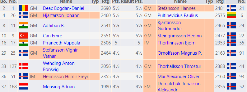 Fjórir Íslendingar eru meðal þeirra 17 keppenda sem eru í skitpu öðru sæti. Það eru stórmeistararnir Guðmundur Kjartansson (2465), Héðinn Steingrímsson (2477) Jóhann Hjartarson (2460) og Hannes Hlífar Stefánsson (2481). Efstur er Kasakinn Alisher Suleymenov (2506).