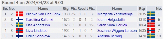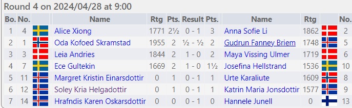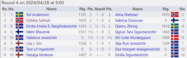 Iðunn vann góðan sigur gegn hinni finnsku Kallunki. Sú finnska tapaði peði eftir byrjunina en upp komu miklar flækjur í kjölfarið. Iðunn reyndist klókari en andstæðingur sinn og vann lið í flækjunum. Eftirleikurinn var auðveldur og Iðunn er áfram í toppbaráttunni með 3 af 4.