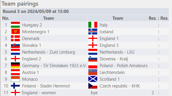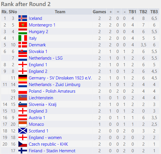 Íslenska liðið er efst ásamt fjórum öðrum sveitum. Helst bar til tíðinda að sveit Svartfjallalands lagði sveit Englendinga að velli í umferðinni. Ísland fær einmitt þessa sveit frá Svartfjallalandi í næstu umferð.