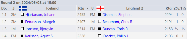 Staðan þegar hér var komið við sögu því 1,5-1,5 og aðeins skák Margeirs Péturssonar gegn Chris Beaumont (2191) stóð eftir á öðru borði. Ljóst að viðureignin myndi ráðast hér!