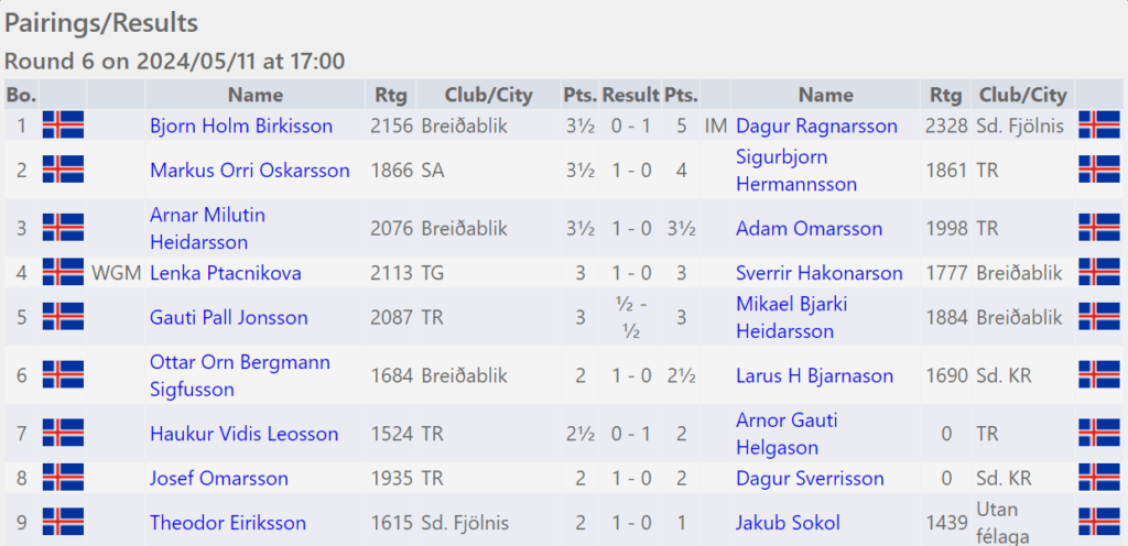 Í sjöttu umferð snerist allt um skákina á efsta borði. Ef Dagur tæki hana væri hann þá þegar öruggur sigurvegari. Lengst af var skákin í jafnvægi, Dagur fékk örlítið betri færi snemma en eftir það var skákin í jafnvægi og hefði líklegast átt að enda með jafntefli. Dagur náði vinna peð en upp kom hróksendatafl sem ætti að vera jafntefli, 3 gegn 2 á sama væng.