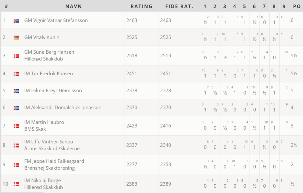 Vignir Vatnar Stefánsson er enn efstur í lokuðum GM flokki í Kronborg skákklúbbnum í Danmörku. Vignir hefur nú 6 vinninga eftir 8 umferðir og er efstur ásamt þýska stórmeistaranum Vitaly Kunin.landsliðsmanninum Tor Frederik Kaasen. Hinir íslensku strákarnir hafa 5 vinninga og 4 vinninga en það eru þeir Hilmir Freyr Heimisson og Aleksandr Domalchuk-Jonasson. Dagurinn gekk skínandi og aðeins misstu strákarnir niður hálfan vinning í dag af því sem í boði var!