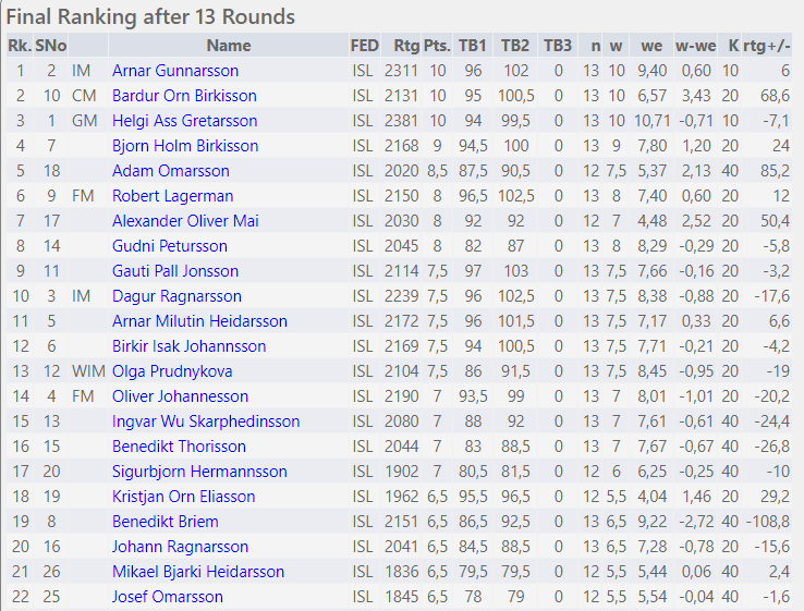 Í lokaumferðunum náðu Björn Hólm og Adam Omarsson óvænt að veita Arnari skráveifu og Helgi Áss Grétarsson og Bárður Örn nýttu sér það til að ná Arnari að vinningum. Arnar hafði hinsvegar teflt á toppnum allan tímann og var því skiljanlega með betri oddastig. Þessi þrír skiptu með sér peningaverðlaunum samkvæmt Hort-kerfinu.