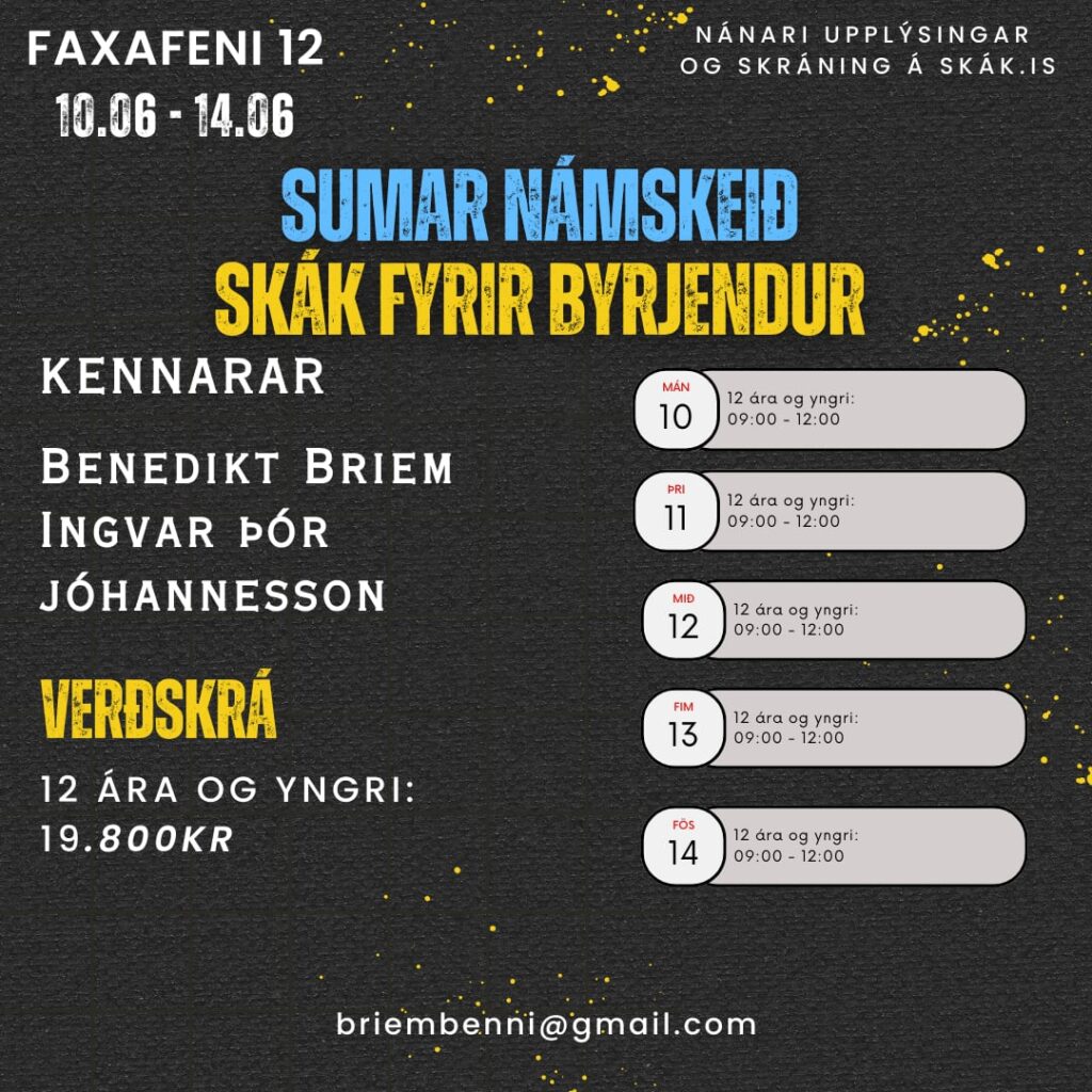 Benedikt Briem býður krökkum áhugasömum krökkum á skáknámskeið í húsnæði Skákskóla Íslands dagana 10.-14. júní nk. Tímar hefjast kl. 9 og lýkur á hádegi kl. 12 alla virka daga í næstu viku. Skákskóli Íslands leggur til húsnæði og alla aðstöðu en öðru leyti er verkefnið skipulagt af Benedikt sem hefur kallað sér til aðstoðar hinn þrautreynda skákkennara, Ingvar Þ. Jóhannesson.