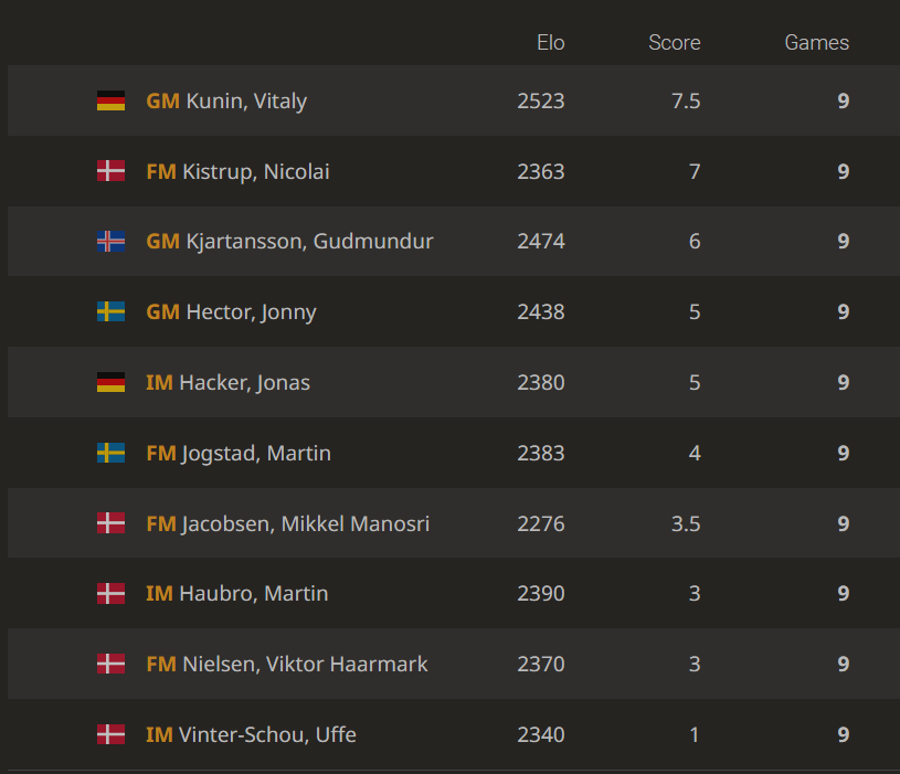 Í fyrri umferðinni mætti Guðmundur danska FIDE meistaranum Nikolai Kistrup (2366) sem átti geysilega gott mót og endaði í öðru sæti. Hann náði að leggja Guðmund að velli, vann af honum skiptamun í miðtafli úr ítalska leiknum þar sem Daninn var að setja töluverða pressu á Gumma.