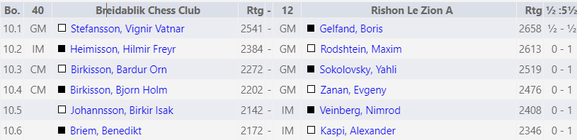 Breiðablik mætti ógnarsterki sveit Rishon Le Zion frá Ísrael. Sveitin skartar sjálfum Boris Gelfand á efsta borði og fyrrum 2700 stiga skákmanni á 2. borði, Rodhstein.