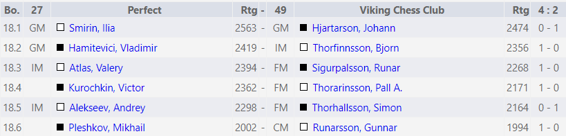 Víkingaklúbburinn mætti sveit Perfect frá Moldavíu. Viðureignin var ekki í beinni en Jóhann lagði Ilia Smirin að velli auk þess sem Símon náði góðum úrslitum. Aðrar viðureignir töpuðust og verða Víkingar að fá meira út úr hvítu mönnunum!