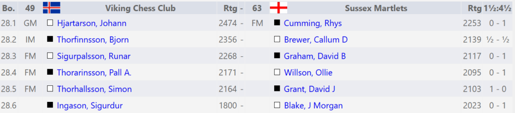 Víkingaklúbburinn náði ekki jafn góðum árangri. Þrátt fyrir að vera stigahærri á fimm borðum af sex urðu Víkingar að lúta í dúk, 1.5-4.5 sem verða að teljast hreint ótrúlegt úrslit!