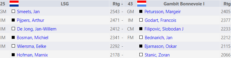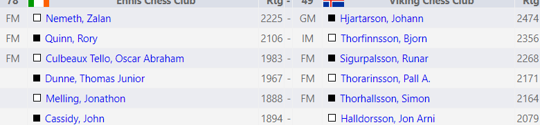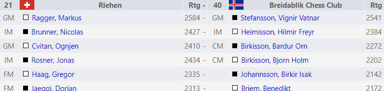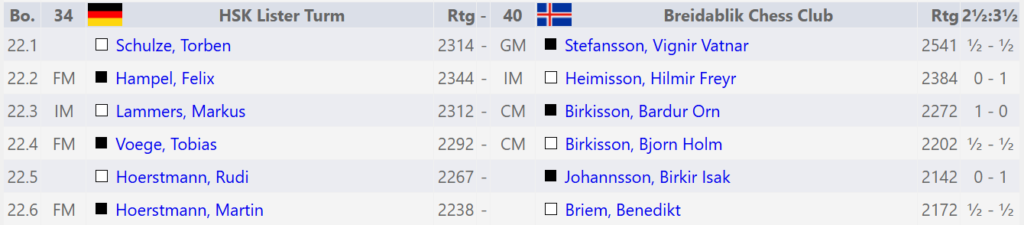 Blikar mættu þýskri sveit sem var á svipuðu róli en örlítið stigahærri heilt yfir. Þrátt fyrir að Þjóðverjarnir væru stigahærri á fjórum borðum af sex þá gáfu Blikar ekkert eftir og enduðu á að vinna sigur 3.5-2.5. Hilmir og Birkir Ísak drógu vagninn með góðum sigrum. Flottur sigur hjá þessari skemmtilegu og efnilegu sveit.