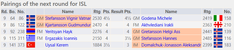 Í níundu umferð sem fram fer á morgun hefur Vignir hvítt gegn Ítalanum grjót-trausta Michele Godena sem hefur oft reynst okkur erfiður á 50+ mótunum. Allir íslensku keppendurnir tefla niðurfyrir sig á stigum.