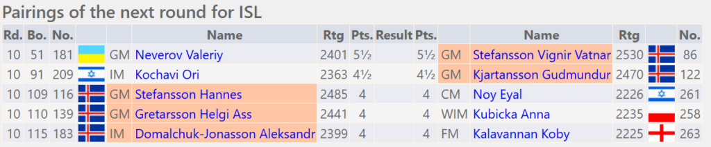 Í tíundu umferð sem fram fer á morgun hefur Vignir svart gegn Valeriy Neverov, traustum stórmeistara frá Úkraínu sem er þó kominn nokkuð til ára sinna. Vignir þarf að ná í sigur til að geta átt einhverja möguleika á Heimsbikarmóts-sæti. Auk Vignis tefla allir niðurfyrir sig. Tveir mótherjar frá Ísrael og Helgi Áss fær möguleika á að hefna fyrir félaga sinn gegn Önnu Kuicka frá Póllandi.