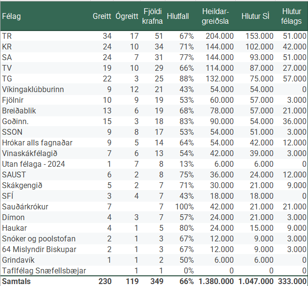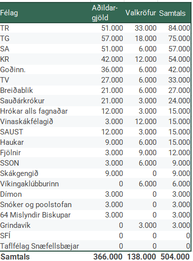 Alls voru send árgjöld til 349 manns og innheimtust 230 kröfur eða um 2/3 af útsendum kröfum. Sendar voru kröfur til 20 ára og eldri sem höfuð virk kappskákstig 1. október sl. Samkvæmt samþykkt aðalfundar SÍ í júní sl. renna 50% af þeim til SÍ en það sem umfram innheimtist rennur til hvers félags.