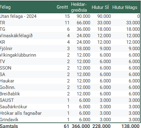 Af því rennur 1.242.000 kr. til SÍ en 504.000 kr.til félaganna.