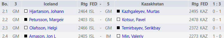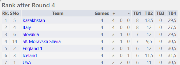 Kazakarnir taka forystu ásamt Ítölum sem lögðu Englendinga að velli. Íslendingar detta aðeins niður stöðutöfluna en engin ástæða til að örvænta. Bandaríkin og England hafa jafnmarga vinninga og íslenska liði og mikið er eftir af mótinu!