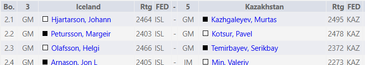 Kazakarnir taka forystu ásamt Ítölum sem lögðu Englendinga að velli. Íslendingar detta aðeins niður stöðutöfluna en engin ástæða til að örvænta. Bandaríkin og England hafa jafnmarga vinninga og íslenska liði og mikið er eftir af mótinu!