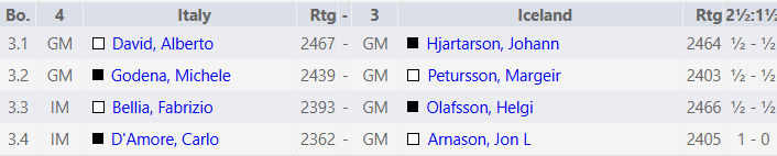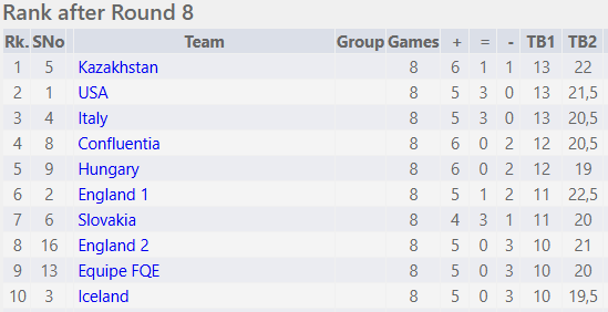 Úrslitin gera það að verkum að Ísland er dottið í tíunda sætið, enn með 10 stig og engir möguleikar á verðlaunasæti. Toppbaráttan er mögnuð, Kazakar, Bandaríkjamenn og Ítalir hafa allir 13 stig og lokaumferðin verður rosaleg!