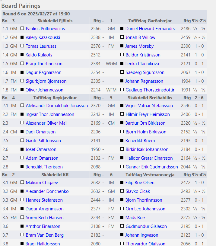 Síðari hluti Íslandsmóts skákfélaga 2024-25 hófst í kvöld í Rimaskóla með sjöttu umferð í úrvalsdeild. Annað kvöld fer fram sjöunda umferð. Aðrir deildir hefjast á laugardaginn.