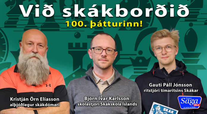 Í þessum eitthundraðasta frumflutta þætti Við skákborðið tekur Kristján Örn á móti þeim Gauta Páli Jónssyni, ritstjóra tímaritsins Skákar og Birni Ívari Karlssyni, skólastjóra Skákskóla Íslands. Umræðuefnið er tímaritið Skák sem kemur út lok vikunnar eða við upphaf síðari hluta Íslandsmóts skákfélaga, Íslandsmótið, Skákskólann, Norðurlandamót ungmenna í Borgarnesi og margt fleira skemmtilegt.
