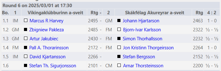 Víkingaklúbburinn hafði betur í sjöttu umferð gegn Skákfélagi Akureyrar og tefla í Úrvalsdeild að ári nema að þeir lendi í stórslysi í lokaumferðinni. Reyndar athyglisvert í ljósi þess að sveitin gaf sætið eftir í upphafi tímabils!
