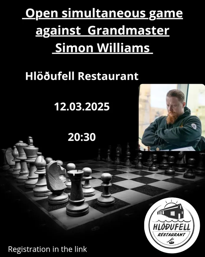 Í tengslum við 20 ára afmælisskákmót Goðans um helgina verður efnt til fjölteflis við enska stórmeistarann Simon Williams sem fer fram á veitingastaðnum Hlöðufelli á Húsavík í kvöld kl 20:30. Fjölteflið er öllum opið en þó verða fjöldatakmarkanir í það og miðast keppendafjöldinn við 25 manna hámark.