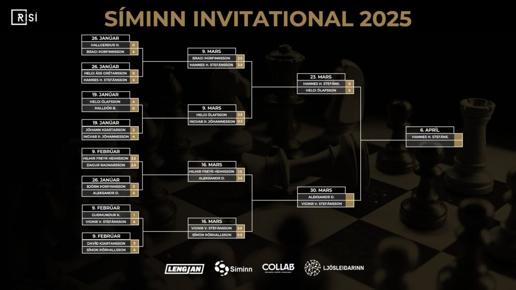 Undanúrslit Síminn Invitational lýkur í kvöld. Sterkasti skákmaður Íslands, stórmeistarinn, Vignir Vatnar Stefánsson, teflir þá við okkar einn efnilegast mann, Aleksandr Domalchuk-Jonasson. Björn Ívar Karlsson og Ingvar Þór Jóhannesson verða með skákskýringar í kvöld.