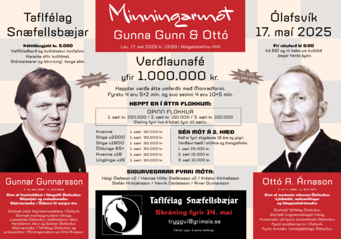 Taflfélag Snæfellsbæjar blæs til glæsilegs minningarmóts 17. maí næstkomandi. Mótið er minningarmót Gunnars Gunnarsson og Ottó A. Árnasonar, báðir merkir menn í sögu Ólafsvíkur. Mótið fer fram í Félagsheimilinu Klifi og hefst klukkan 13:00.