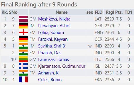 Lettneski landsliðsmaðurinn Nikita Meskovs varð hlutskarpastur með 7,5 vinning. Guðmundur byrjaði eins og áður sagði vel en um miðbik móts fékk hann aðeins 1 vinning í 5 skákum og munaði um minna.