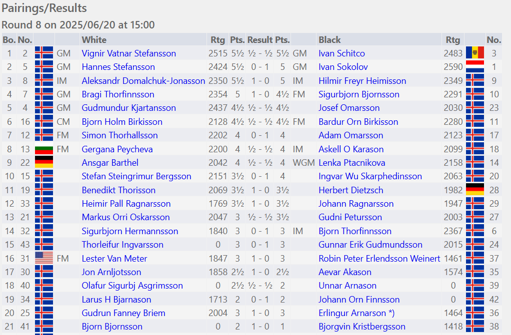Á efsta borði sætti Vigni sig við jafntefli í rólegri stöðu gegn Ivan Schitco. Eins og úrslitin lentu gæti jafnteflið hafa verið besta í stöðunni fyrir Vigni. Sannleikurinn kemur í ljós á morgun!