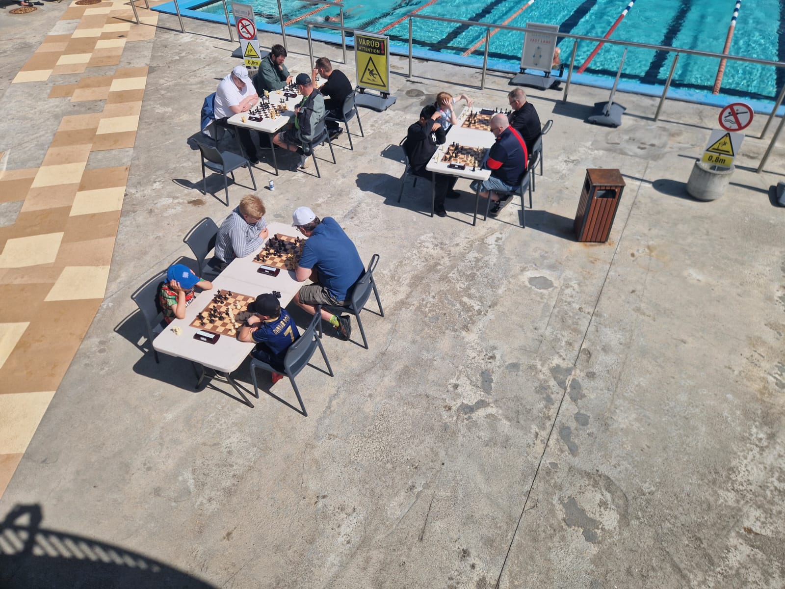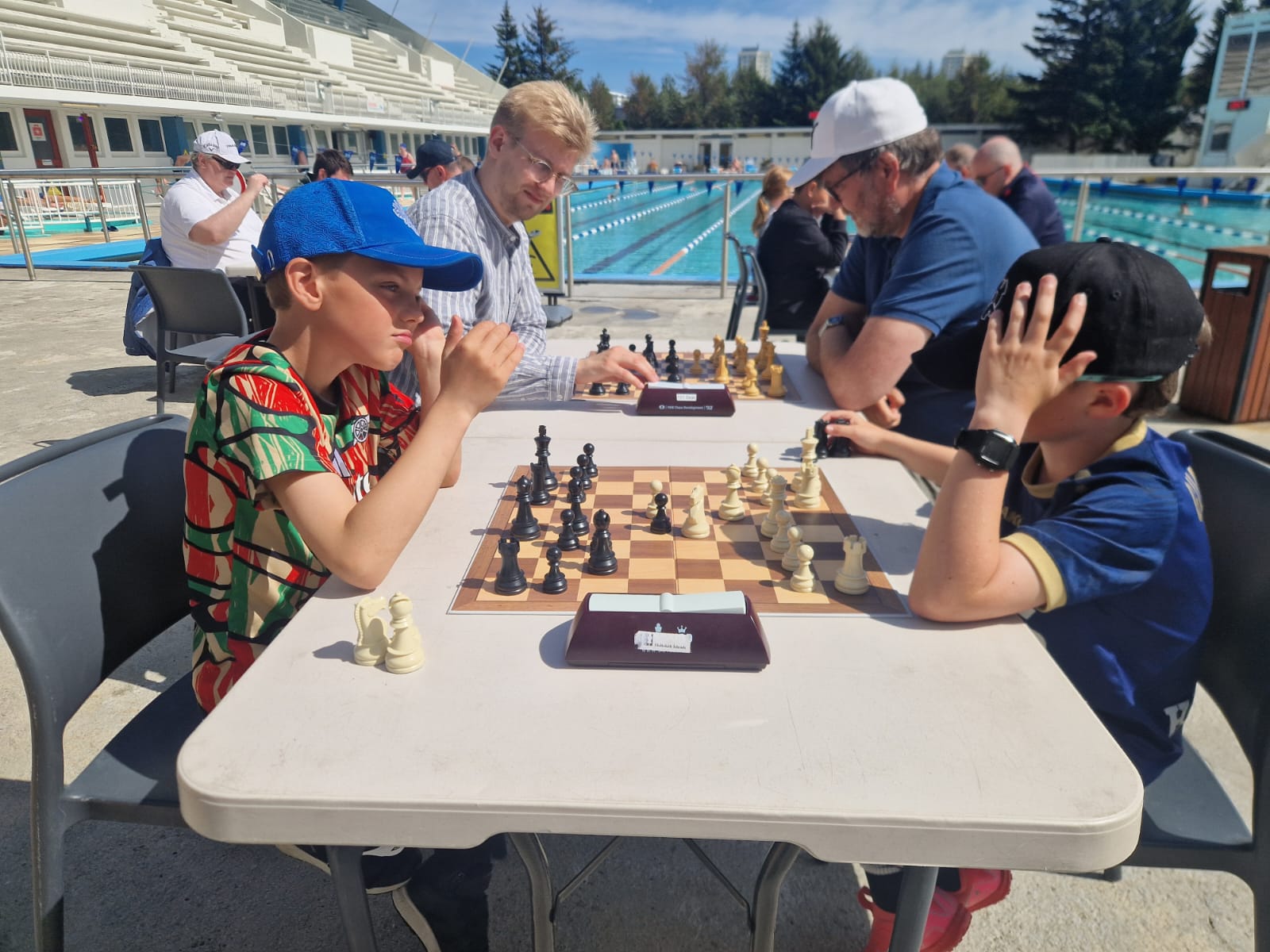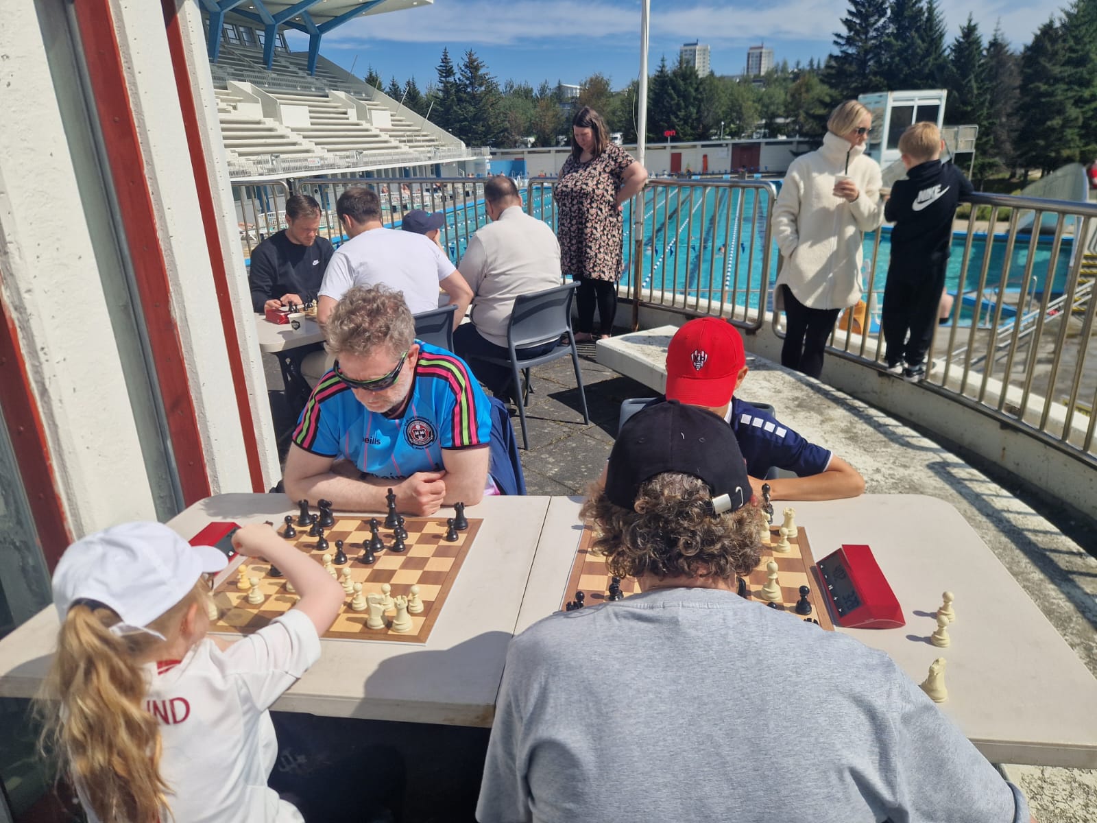 Menningarfélagið Miðbæjarskák hélt Skákmót Laugardalslaugar þann 6. júlí í alveg þokkalegu veðri, sem hentar afar vel á útiskákmótum. Þátttakendur voru 21, sem er eflaust ágætt um þessa miklu ferðahelgi sem fyrsta helgin í júlí er. Svo fór að þrír titilhafar röðuðu sér í þrjú efstu sætin. Efstur þeirra var alþjóðlegi meistarinn Dagur Ragnarsson, sem fékk 6.5 vinning af 7 mögulegum, en teflt var með tímamörkunum 4+3. Dagur var á Íslandi bara þennan eina dag, á milli ferðalaga heimshorna á milli til að tefla kappskákir gegn indverskum börnum.