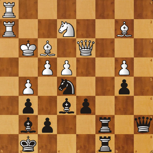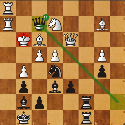 Eins og áður sagði þá má riddarinn ekki hreyfa sig útaf mátinu á h8 og því eru góð ráð dýr. Finni svartur ekki lausn hér tapar hann liði. Lausnin reynist vera 37…Df2!! sem er hreint stórkostlegur leikur! Það kemur á daginn að sama hvernig hvítur tekur á f2 kemur …Rxd3 og það er ekki lengur mát á h8. Svartur vinnur lið!