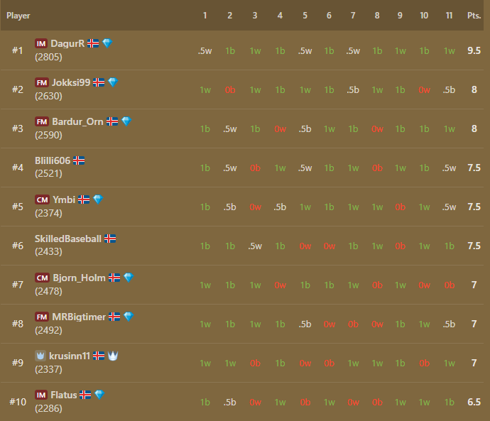 Nokkrir titilhafar fylgja með inn í lokamótið. FIDE-meistararnir Jón Kristinn og Bárður Örn fengu 8 vinninga. Með 7,5 komu Birkir Ísak Jóhannsson og Dagur Andri Friðgeirsson nokkuð óvænt. Daði Ómarsson vann sér einnig sæti en gaf það eftir. CM Björn Hólm var inni á oddastigum á kostnað FM Róberts Lagerman en þar sem Daði tekur ekki þátt fær Róbert sæti á mótinu! Markús Orri var grátlega nálægt en varð úti á oddastigum.