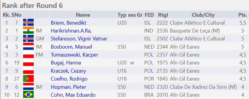 Benedikt Briem er nú einn í efsta sæti á Lagos Open í Portúgal en hann lagði pólska FIDE-meistaranum Kacper Tomaszewski að velli í sjöttu umferð eftir glæsilegan viðsnúning í krefjandi skák. Stórmeistarinn Vignir Vatnar Stefánsson vann sína skák, hefur unnið allar sínar tefldu skákir og þeir félagar mætast í sjöundu umferð og hefur Benedikt hvítu mennina.