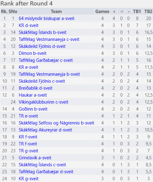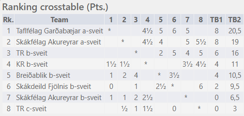 Taflfélag Garðabæjar eru efstir ásamt Akureyringum en Garðabær hefur náð fleiri vinningum. TR-b sveit gæti átt inni góðan seinni hluta ef raðirnar þéttast hjá A-liðinu í seinni hlutanum en toppliðin eiga öll eftir að tefla innbyrðis.