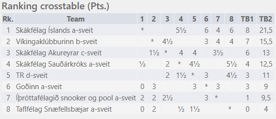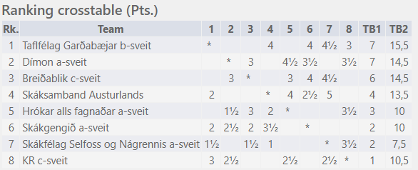 Taflfélag Garðabæjar hafa jafn mörg stil og Dímon en hafa náð einum vinningi fleira. Liðin mætast í seinni hlutanum.
