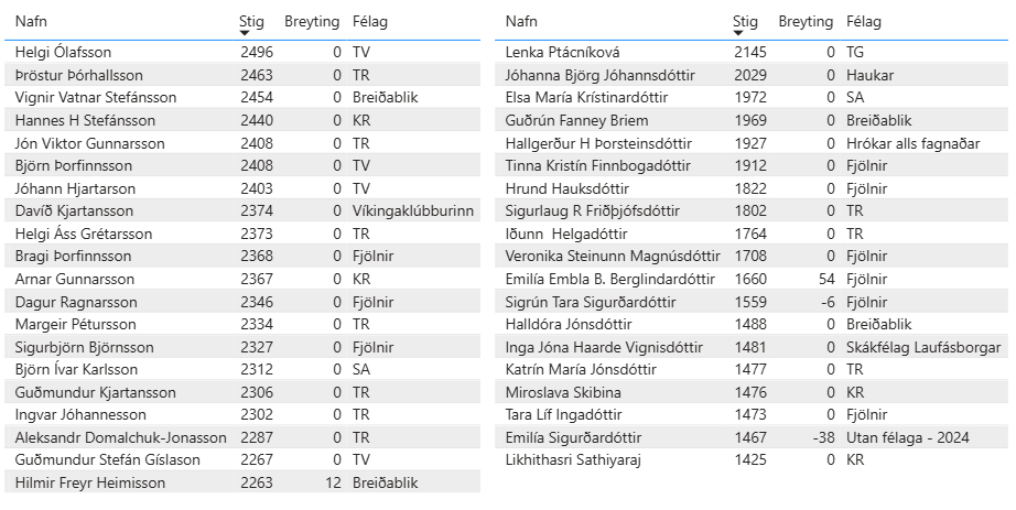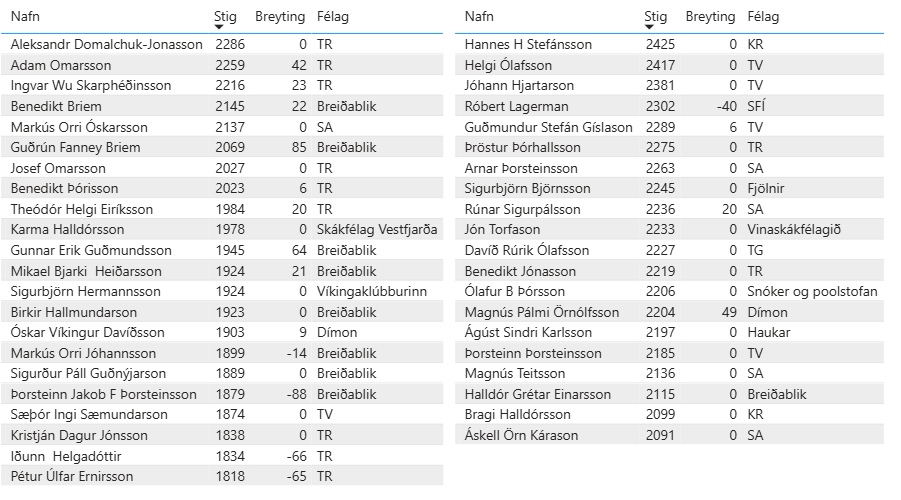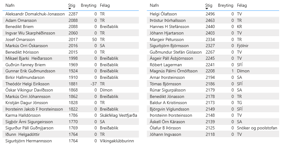 Aleksandr Domalchuk-Jonasson (2287) er stigahæstur ungra skákmanna Helgi Ólafsson (2496) er stigahæstur á vizkualdrinum.