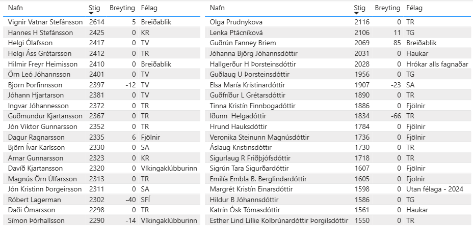 Vignir Vatnar Stefánsson (2614) hækkaði um 5 stig í mánuðinum og er langstigahæstur íslenskra skákmanna í harðskák. Olga Prudnykova (2116) er stigahæst skákkvenna en bæði Lenka Ptácníková (2106) og Guðrún Fanney Briem (2069) nálgast hana.
