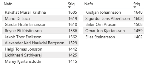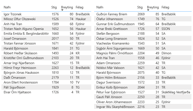 Igor Trzonek (1576) úr Breiðabliki hækkaði mest í atskák eða um 80 stig en í hraðskák var það áðurnefnd Guðrún Fanney (2069) einnig úr Breiðablik sem hækkaið mest eða um 85 stig.