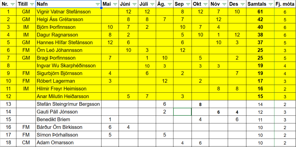Skemmtilegur árangur hjá Hilmi sem kemst í topp 12 og lokamótið þrátt fyrir að hafa bara teflt á tveimur síðustu mótunum!