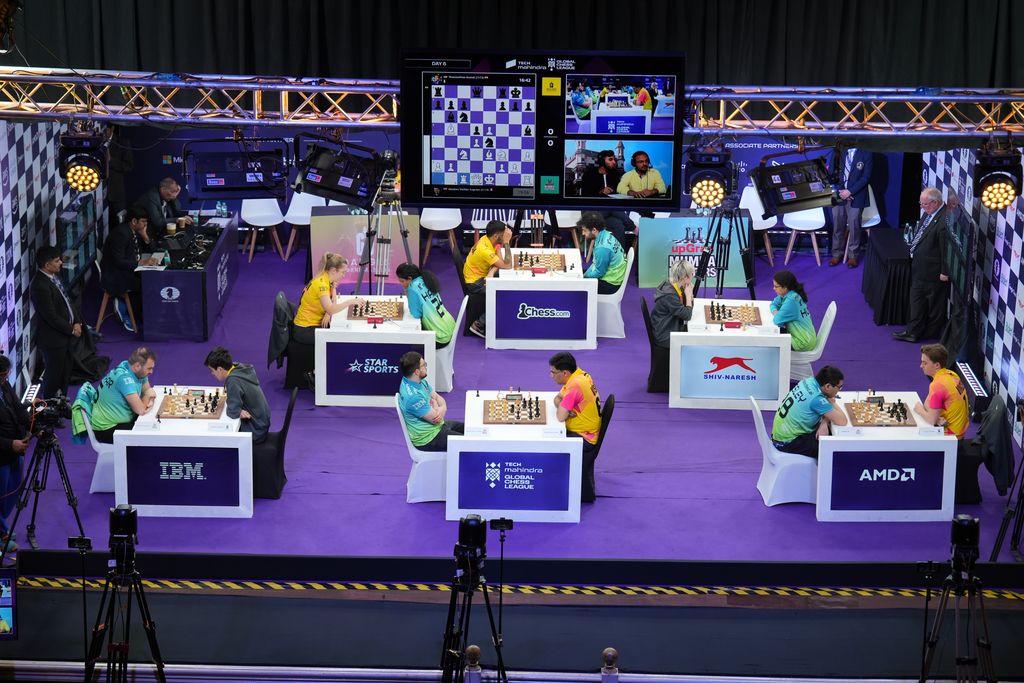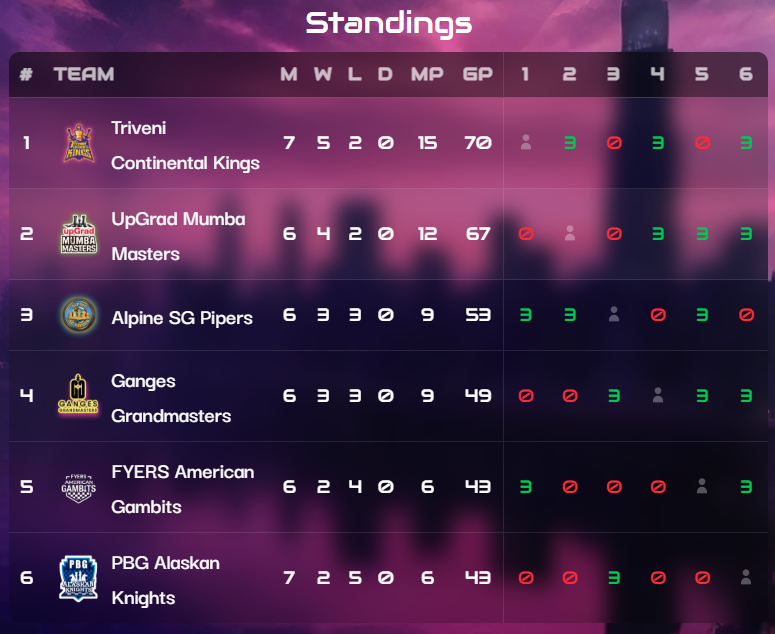 UpGrad Mumba Masters eiga einn leik til góða og geta náð Kings ef þeir vinna hann. Liðin tvö standa best að vígi um sæti í úrslitum en þangað komast tvö efstu liðin. Alpine SG Pipers og Ganges Grandmasters (Anand á fyrsta borði) eru enn með góða mögulega til að blanda sér í baráttuna um tvö efstu sætin með góðum árangri í umferðunum sem eftir eru.