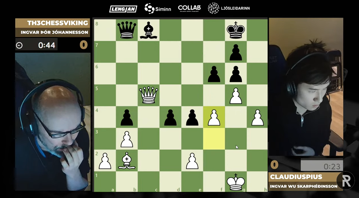 Í miðtaflinu tók Ingvar Þór yfirhöndina en náði ekki alveg að nýta sér stöðuyfirburðina og í tímahraki var alls ekki ljóst hvað myndi gerast þegar Ingvar eldri missti aðeins tökin, jafnt tafl en ákveðin undiralda. Á ögurstundu gleymdi Ingvar Wu sér og tapaði manni og eftirleikurinn auðveldur þar sem svarti kóngurinn átti alltaf gott skjól