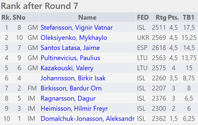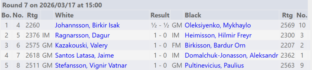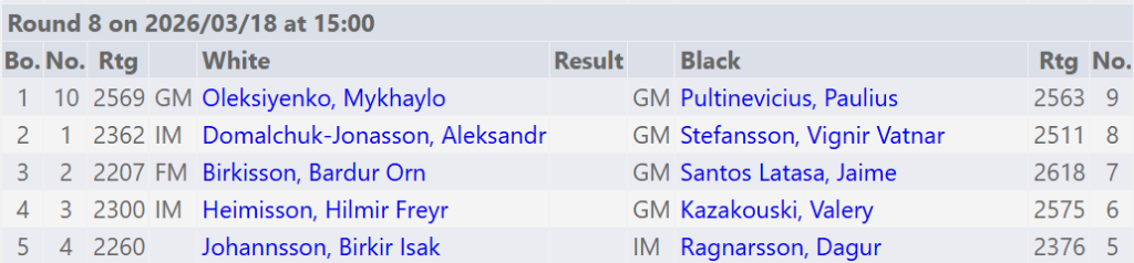 Mótið heldur áfram á morgun í Stúkunni í Kópavoginum en skákirnar hefjast sem fyrr 15:00, áhorfendur velkomnir. Vignir fær svart gegn Aleksandr og þarf að vinna til að gera atlögu að toppsætinu. Birkir Ísak tryggir sér IM-áfanga leggi hann Dag að velli með hvítu mönnunum. Mykhaylo og Paulius slást um að halda sér í toppbaráttunni.