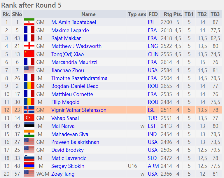 Næstu Íslendingar hafa 3,5 vinning en meðal þeirra eru Aleksandr Domalchuk-Jonasson, Björn Þorfinnsson, Benedikt Briem og Guðmundur Kjartansson.
