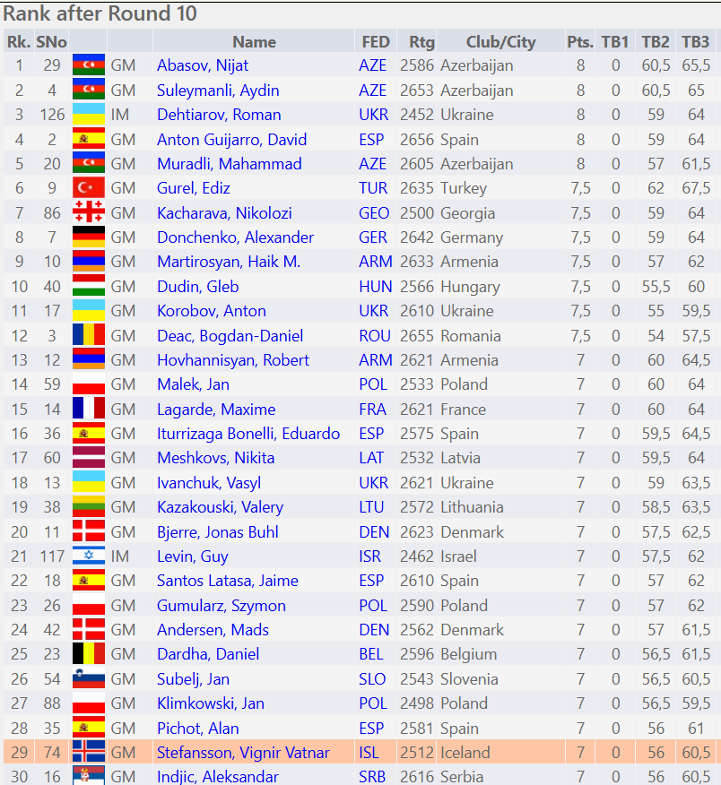 Þrír Azerar af efstu fimm mönnum með 8 af 10. Vignir er í 29. sæti á oddastigum, gæti komist hærra með hagstæðum úrslitum annarra keppenda á oddastigum en verður að öllum líkindum að vinna til að komast í topp 20.