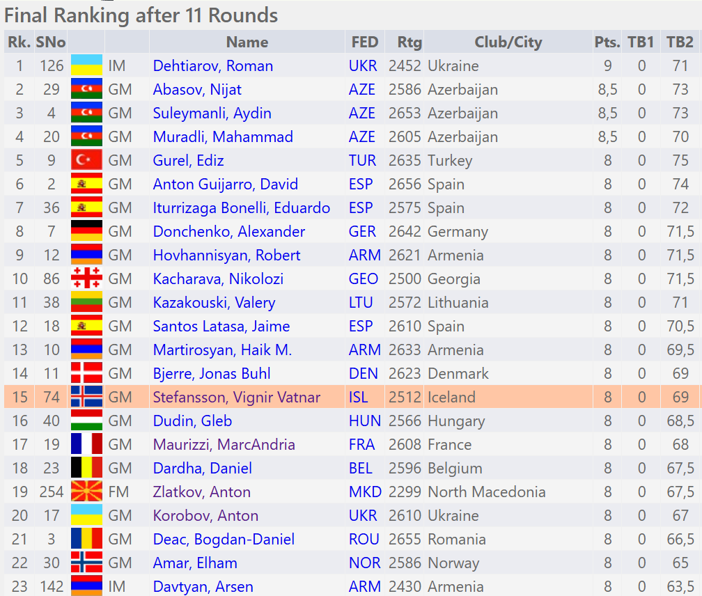 Lokaniðurstaðan því 8 vinningar af 11 hjá Vigni, enn og aftur stórkostlegur árangur og 15. sætið niðurstaðan!